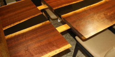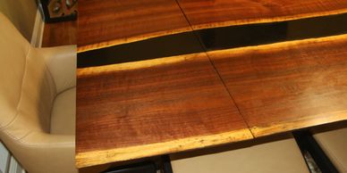 The entire table was made from two pieces of a single black walnut tree. With a single epoxy pour, we then cut the last 2-feet from each end to make removable wings. They ae easily installed by one person, and latch into place.